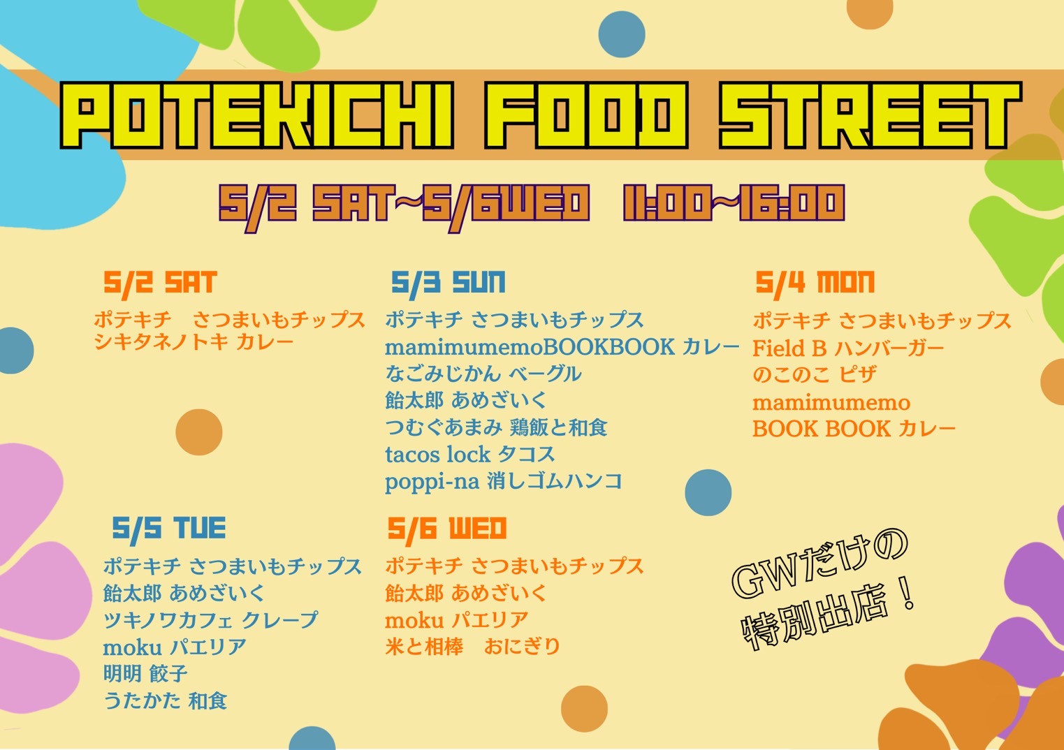 5月2日(土)~5/6(水祝)開催 11:00~16:00、雨天決行、荒天中止 うまいもんまつりでおなじみのポテキチや、いろいろなフード屋台が集合します! ぜひお気に入りのお店を見つけてみてくださいね! 一部配布チラシで誤植がありますが、開催日は以下の通りです。 5/2(土)~6(水祝) ちるみゅー公式LINEはこちら⬇️